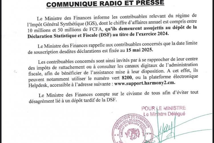 Newsletter Abonnez-vous à la Newsletter et ne manquez aucune actualité de la Direction Générale des Impôts. Saisissez votre adresse e-mail Ne manquez rien ! Email The subscriber's email address. Circulaire MINFI précisant les modalités d'application de la procédure amiable dans le cadre des convenions fiscales de non double imposition conclues par le Cameroun Circulaire MINFI p UNE MISSION DU FMI SEJOURNE A LA DGI UNE MISSION DU FMI SE REPERTOIRE DES CENTRES DE GESTION AGREES COMMUNIQUE-PRESSE communiqué radio-pres COMMUNIQUE-PRESSE COMMUNIQUE